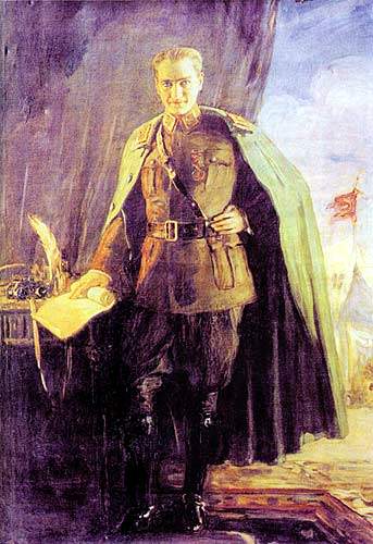 Renkler: Resimde hakim olan kahverengi ve tonları, Atatürk’ün ciddiyetini ve kararlılığını vurgularken, altın sarısı tonları da gücünü ve kudretini simgeliyor olabilir.